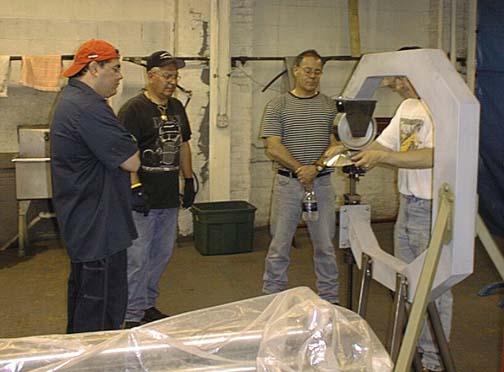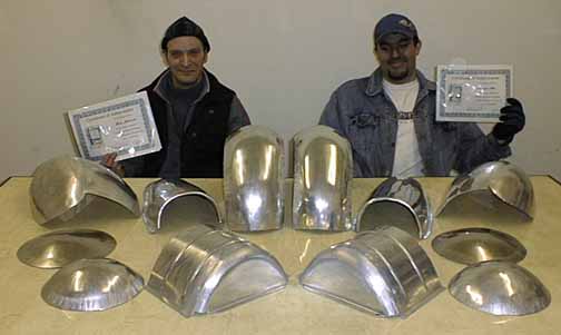 Completed projects (from left to center - gas tank side tacked to top, aluminum dish, steel dish, hood scoop, wheel tub and wide fender) - Chris, Mike, Tom - More pictures from first workshop.